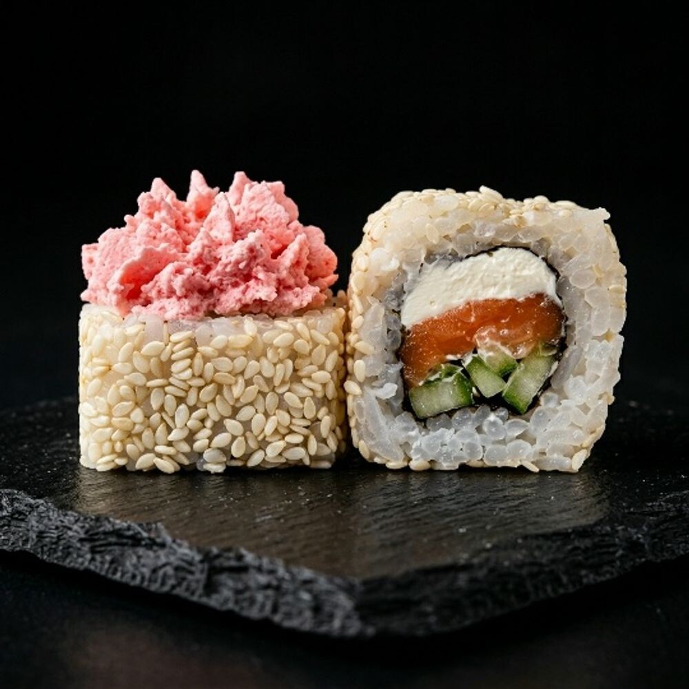 Нори, рис, лосось, сливочный сыр, огурец, соус лава, кунжут