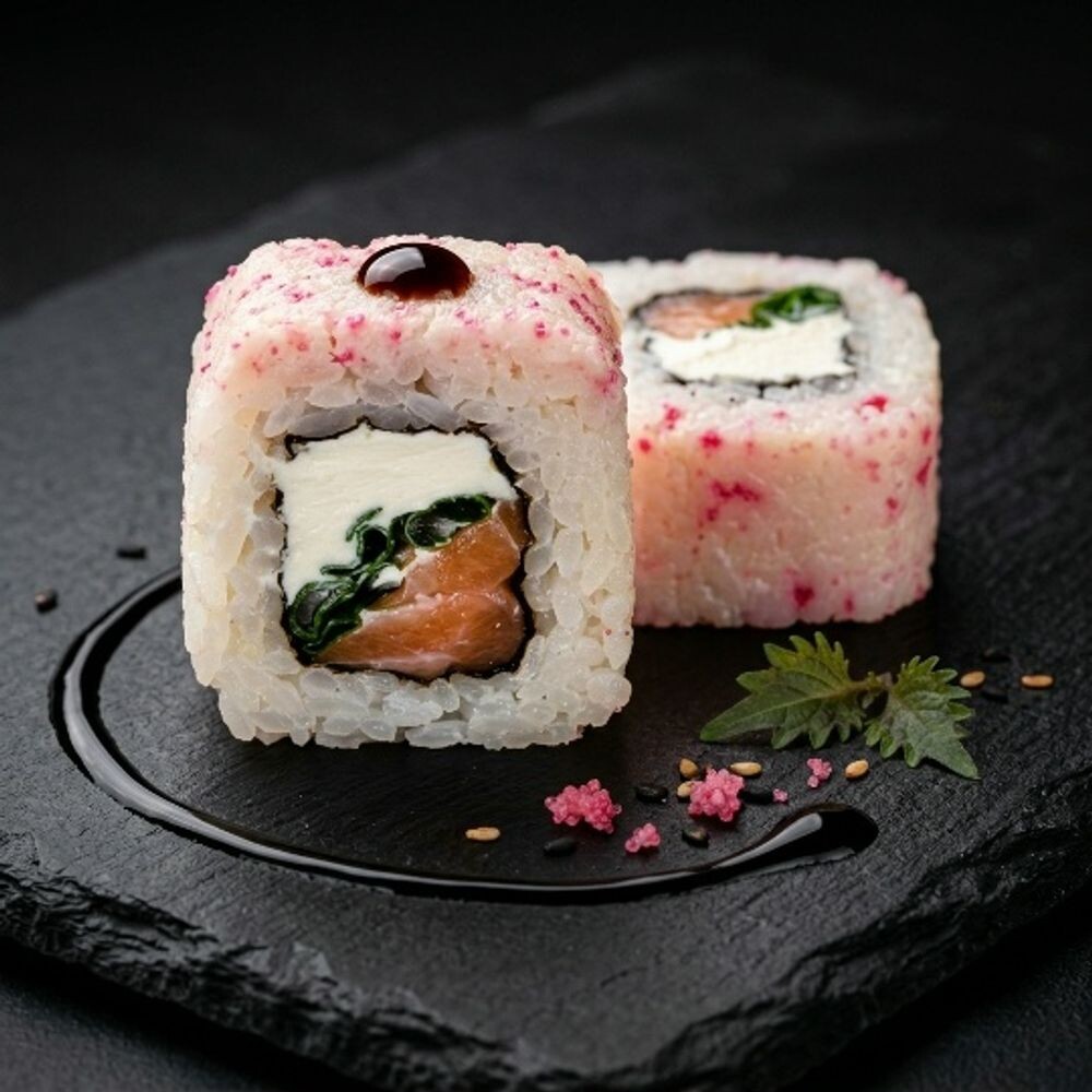 Нори, рис, лосось, сливочный сыр, зел. лук, крабовое сурими, соус унаги