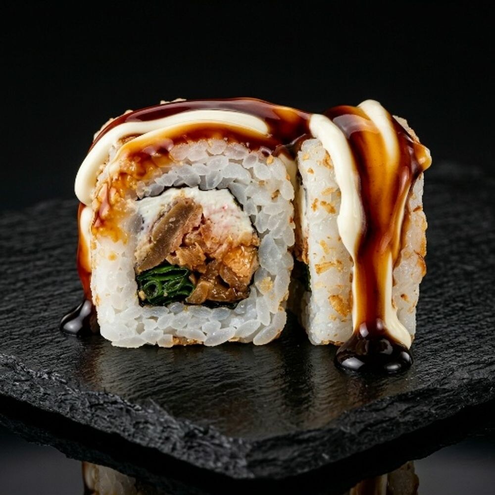 Нори, рис, курочка, сливочный сыр, , зел. лук, лук кранч, соус унаги, соус цезарь