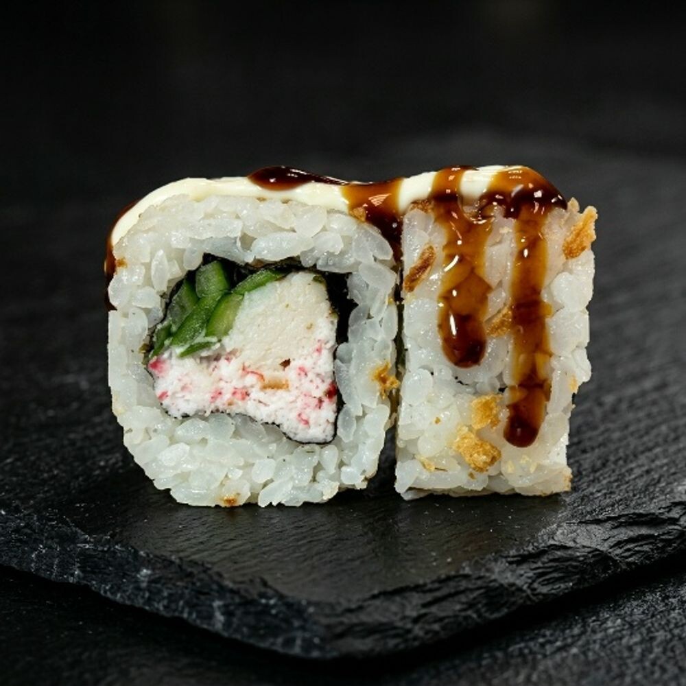 Нори, рис, курочка, крабовое сурими, огурец, лук кранч, соус унаги, соус цезарь
