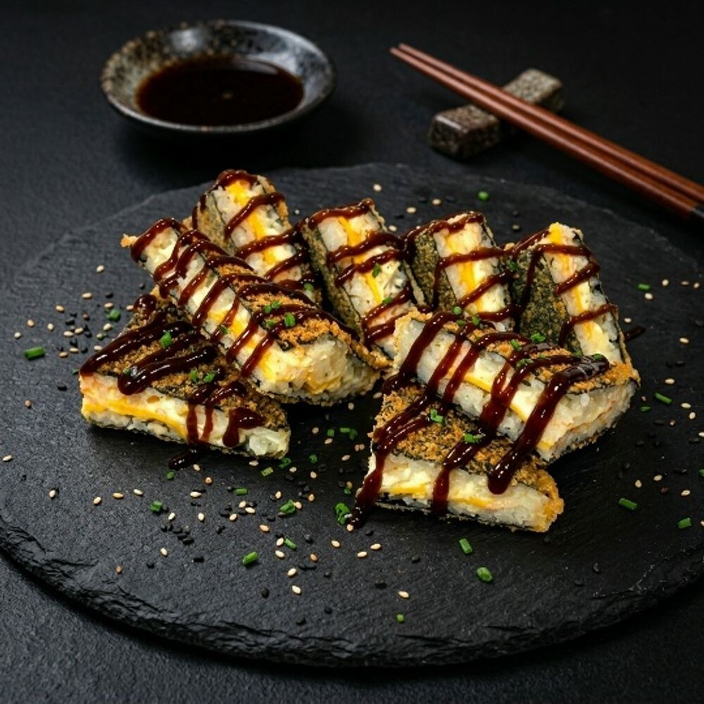 Рис, нори, сыр сливочный, сыр Чедр, крабовое сурими, кляр, сухари панко, соус барбекю