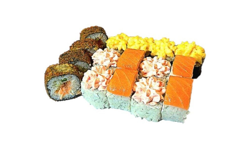 Филадельфия 1/2, Лава 1/2 , Запеченный лосось1/2 , Жареный с лососем 1/2