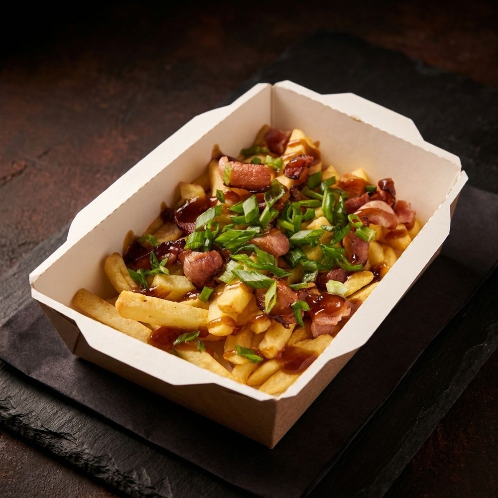 Картошка фри, бекон, соус барбекю, зеленый лук