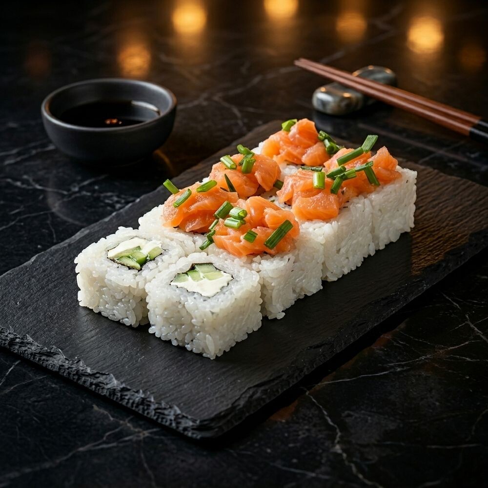 Рис, Нори, лосось, лук зеленый, сыр креметта, огурец