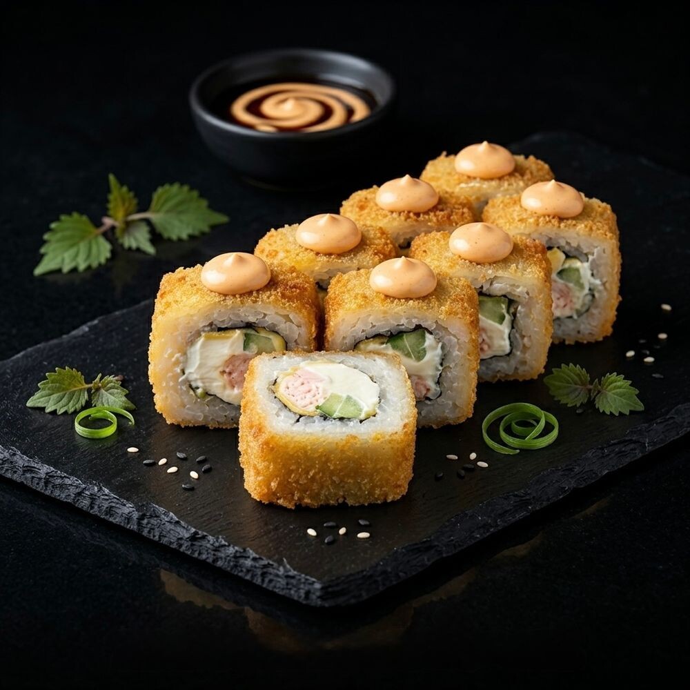 Рис, нори, курица, сыр креметта, огурец, сыр чеддер, кляр, сухари панко, спайси соус
