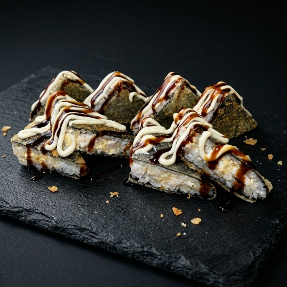 Рис, нори, курица, сырный соус, кляр, сухари панко, соус цезарь, соус унаги.