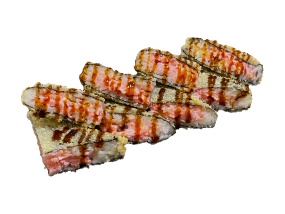 Рис, нори, лосось, соус лава, кляр, сухари панко, соус унаги