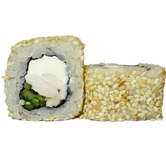 Рис, нори, сливочный сыр, огурец, лосось жареный, соус лава, кунжут